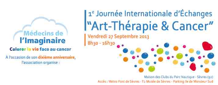 Ainsi a émergé la co-construction d’un savoir sur ce que les processus de création peuvent apporter dans l’accompagnement du parcours de soin. Aujourd’hui en France, l’art-thérapie s’inscrit dans le domaine des soins de support en cancérologie, comme dans d’autres pays où des expériences semblables se sont tissées parallèlement. Afin de partager ces belles expériences ainsi que son expertise, l’association a décidé d’organiser, le 27 septembre prochain, la 1re Journée Internationale d’Echanges sur le thème “Art-Thérapie & Cancer” qui réunira des art-thérapeutes du Canada, de Suisse, d’Angleterre, des Pays-Bas et toute l’équipe de MDI. Il sera laissé une large part aux échanges avec la salle qui rassemblera côte à côte patients, bénévoles, soignants, art-thérapeutes, étudiants, partenaires et sympathisants. Des invitations créatives seront aussi faites aux participants. Cette journée est parrainée par L'Institut National du Cancer avec le soutien fidèle d'AG2R la Mondiale Vendredi 27 Septembre 2013